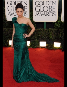 En general he de decir que no me entusiasmaron demasiado. Como me dijo Nurinur, no hubo ninguno de esos que nos hacen casi soltar lágrimas de emoción como el rojo que llevó Heidi Klum en los Oscar de 2008 (madre mía cómo pasa el tiempo…) y que fue tan adorado que se subastó con fines benéficos (lástima que yo ni siquiera aspirara a entrar en la puja). Pero sí que hubo alguno especialmente bonito. A mí, la que más me gustó fue, sin ninguna duda, Catherine Zeta-Jones con su precioso vestido de seda en verde botella, único y original (el vestido, el color sí que se repitió por la alfombra roja). [Certifico aquí mi cada vez más firme voluntad de encontrar un vestido de un verde de este tipo en corto para alguna de las dos cenas de graduación que tengo este año. Si se parece al globo de Serena Van der Woodsen en la primera temporada de Gossip, mejor]. Verde y precioso también era el Vera Wang de Mila Kunis. Y verde también, aunque ni de lejos tan bonito, era el Donna Karan que eligió Elisabeth Moss.