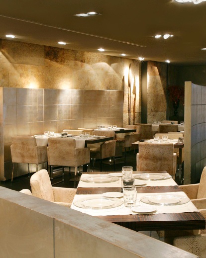 El restaurante (Europa Déco) sigue la misma línea y mantiene una decoración muy cuidada y moderna, con iluminación digitalizada, paneles acristalados, chimenea forrada en pan de oro y sillería con pies de acero tapizadas con piel de textura de iguana. Ni siquiera había manteles, sino una especie de láminas de piel que seguían totalmente las tendencias de la temporada: dorado + estampado rugoso.