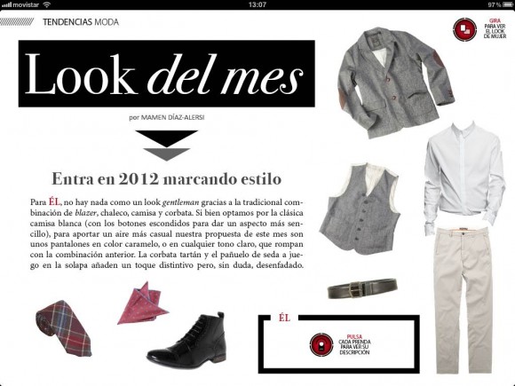 ¿Los temas? Pues se divide en tres grandes secciones: Estilo de Vida (business, cuerpo y mente, ocio, ciencia, gourmet…); Tendencias (moda, tecnología, decoración, gadgets…); y Cultura (cine, música, teatro, literatura…). Como os conozco, os dejo aquí algo de la parte de moda de este primer número de enero: los looks para él y para ella escogidos por la siempre genial Mamen Díaz-Alersi, autora de El blog de moda por excelencia. Pero esto no os exime de descargárosla. Además, con capturas de pantalla no se disfruta igual.