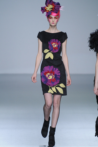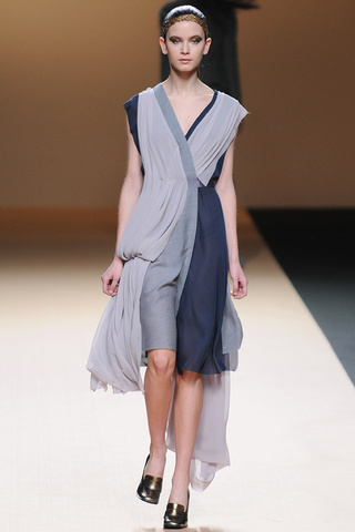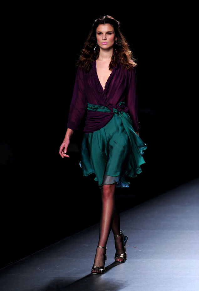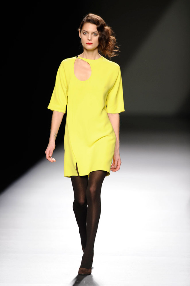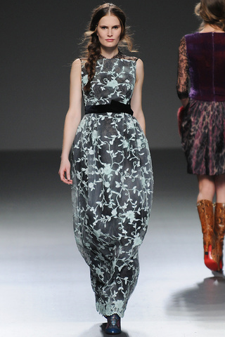 Pero lo verdaderamente importante (al menos en teoría) son los desfiles. Yo ayer pude vivir los momentos previos al de Victorio y Lucchino y ayudar en el sitting (vamos, decirle a la gente dónde le tocaba sentarse según su invitación) y fue bastante divertido. Ver a las clientas señoronas de segunda fila posando para intentar salir en las fotos del front-row (por cierto: Cristina Tárrega, Carmen Lomana, Jesús Mariñas… ¿¿¿WTF???), ver a los bloggers conocidos animando el cotarro, adivinar quién había ido de cada revista (todo un reto), etcétera. No voy a mentiros y deciros que el desfile me emocionó sino más bien lo contrario: reminiscencias a Prada y a Miu Miu de hace como dos años, mezclas imposibles que parecen primavera, pieles en sitios insospechados… un abandono de sus raíces hacia no se sabe bien dónde que no triunfó. Todas las fotos del desfile: aquí, pero yo os dejo con el único vestido que salvé.